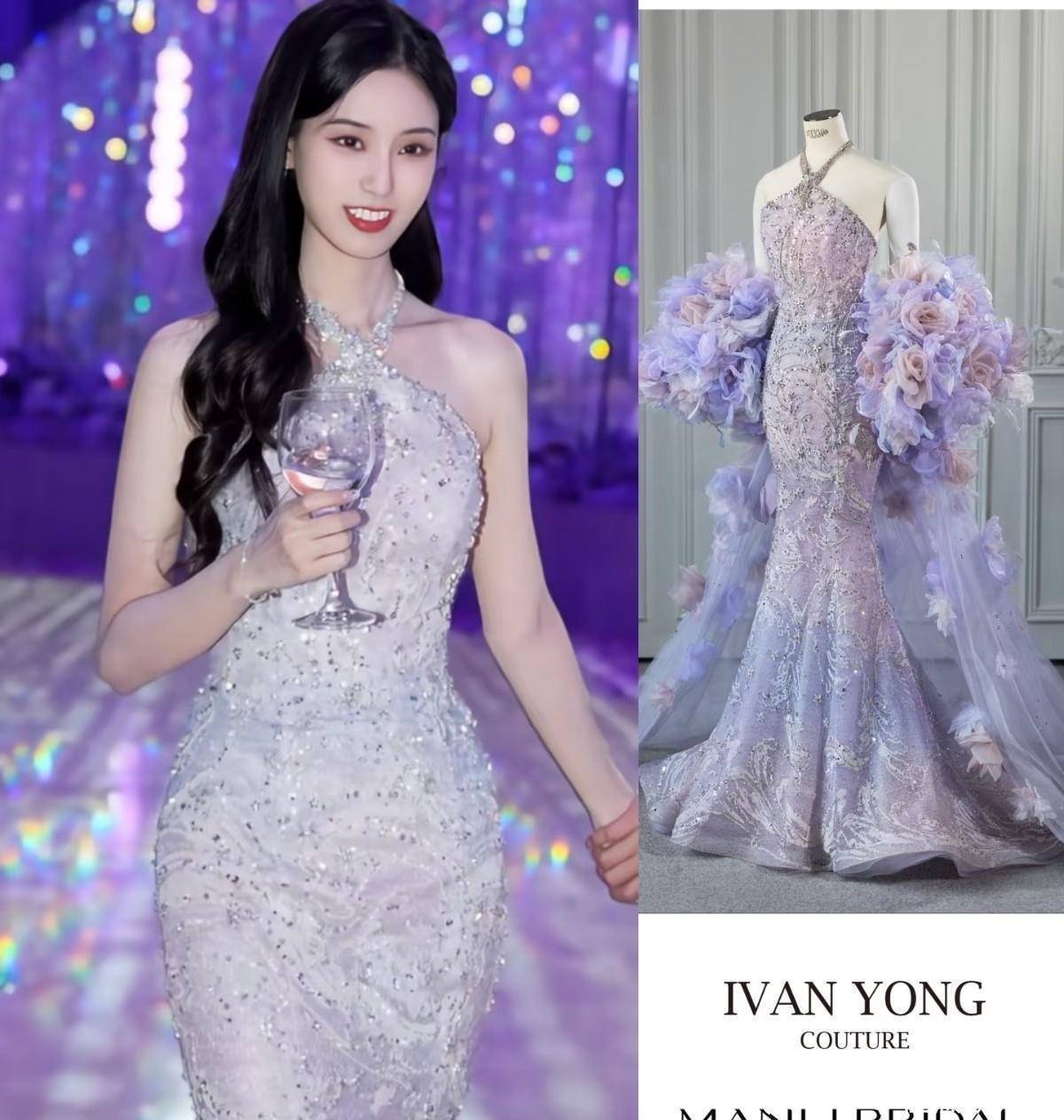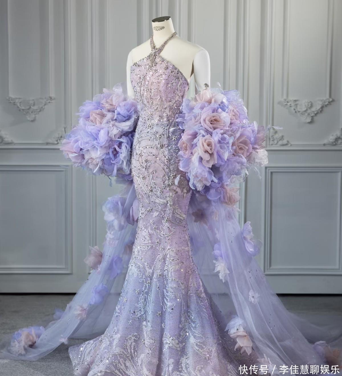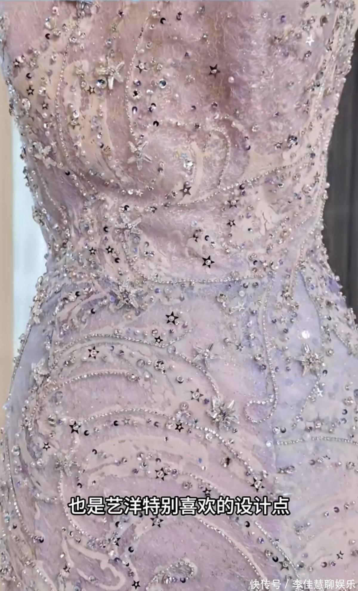 这款礼服是紫色渐变鱼尾礼服,这套礼服的颜色和上面的星月装饰设计,都是徐艺洋喜欢的!而且这个设计也是根据徐艺洋的身材来的!是两大品牌独家设计的联名款!