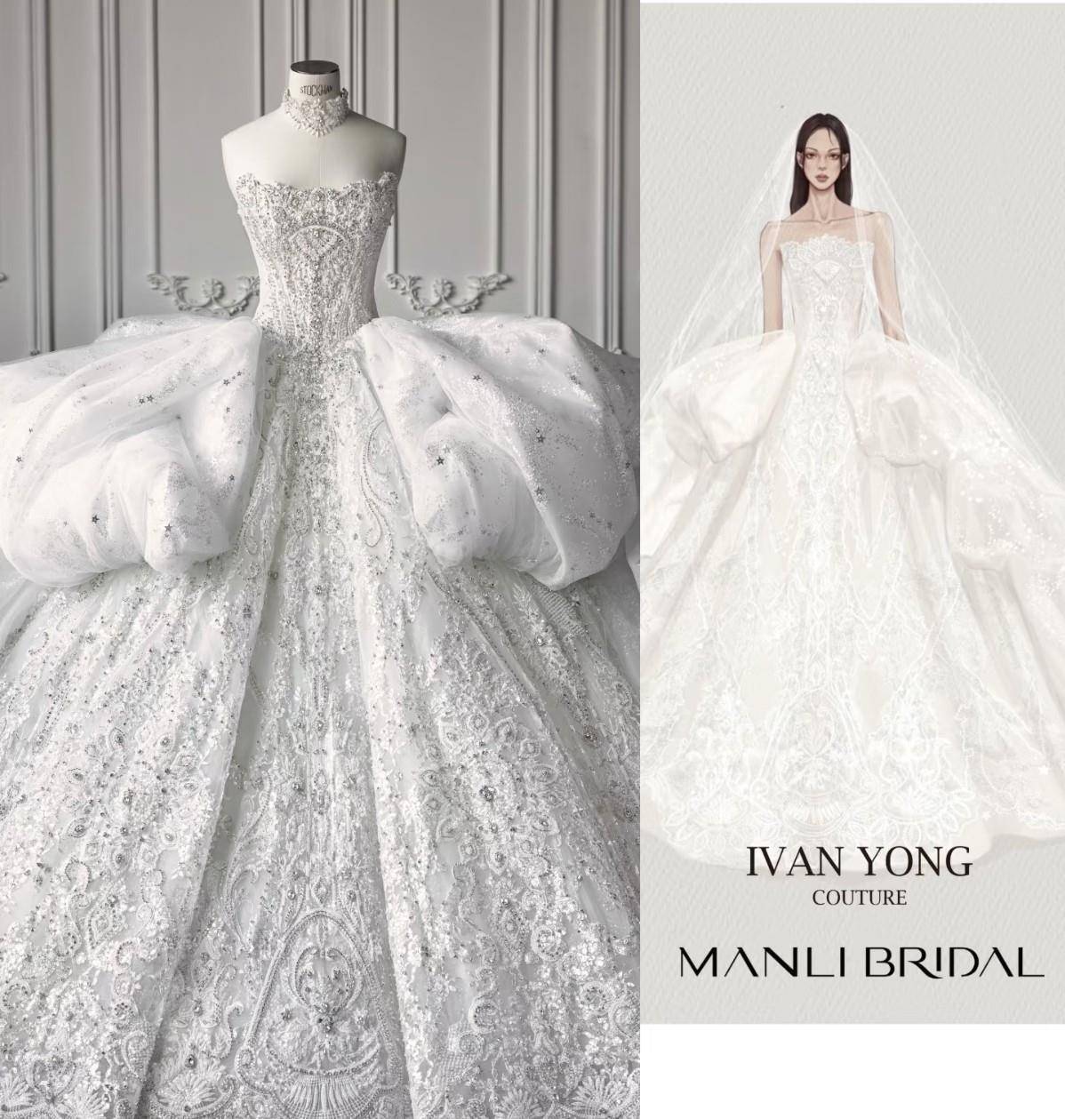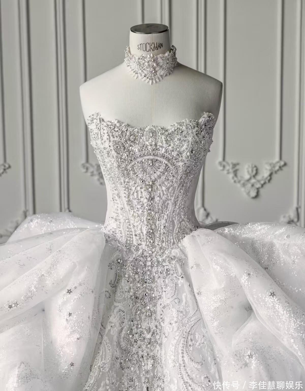 这套婚纱是特别定制的,花纹啥的都是手工的,而且仔细看上面还点缀着星星亮片,非常符合他们婚礼的主题,星空婚礼!